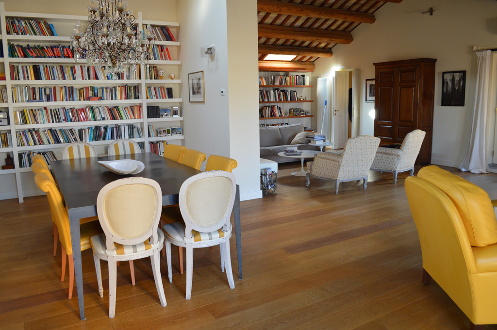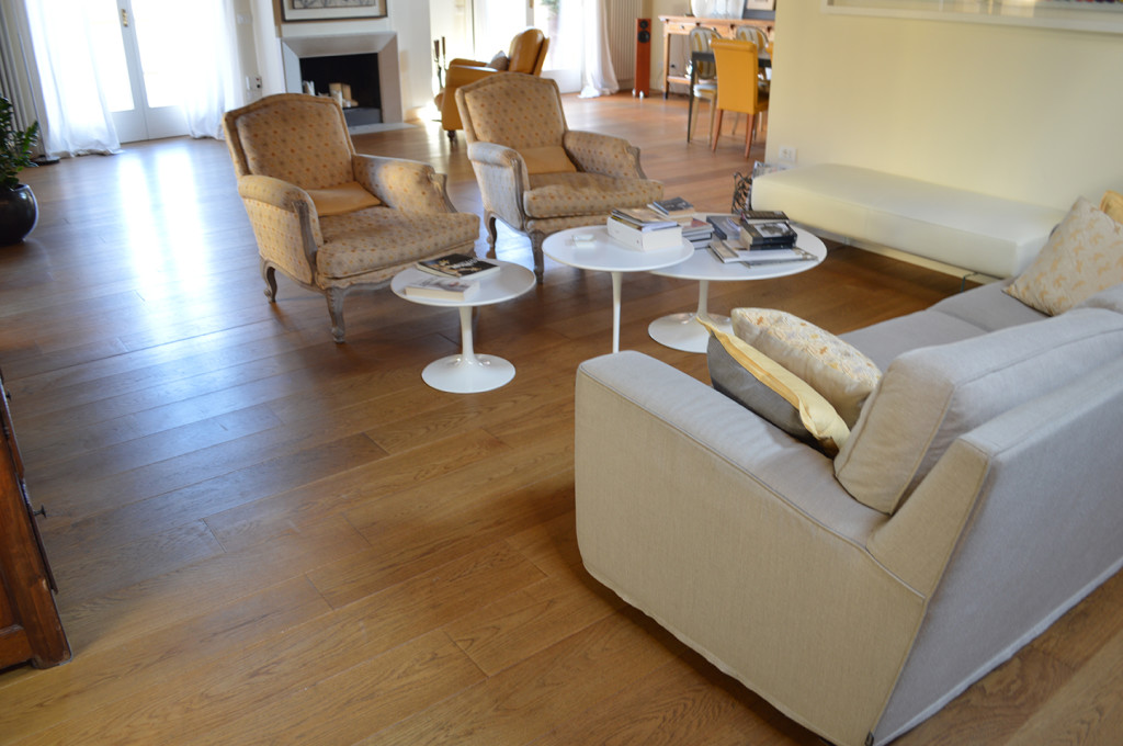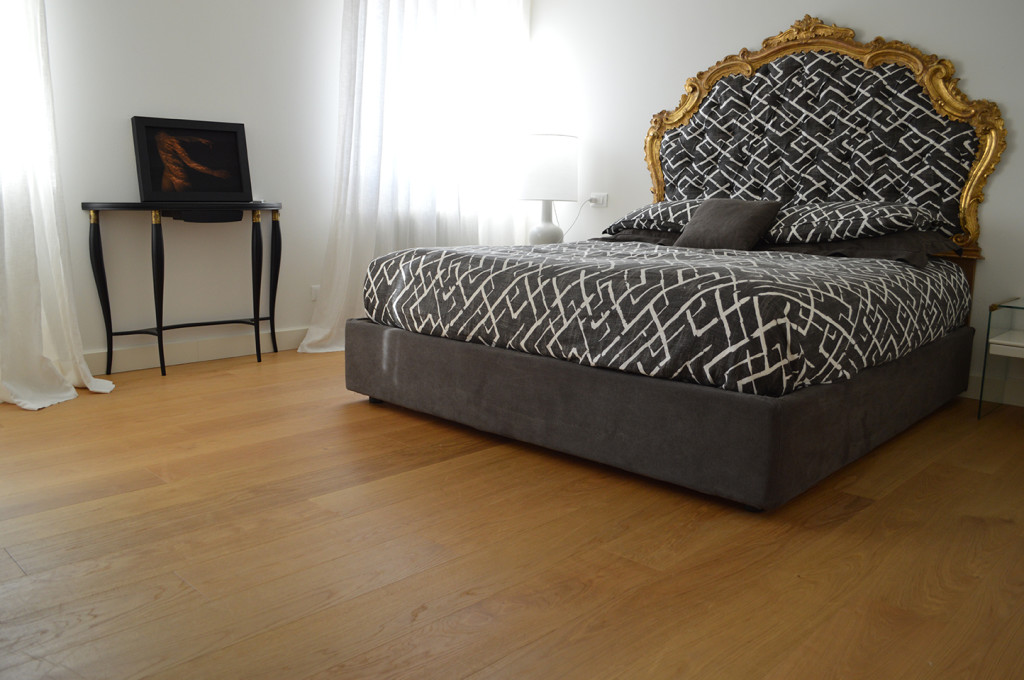 Protagonista assoluto il parquet: tavole di quercia di grandi dimensioni con finitura spazzolata, color tortora per la zona giorno (salotto e sala da pranzo), e oliate ‘naturali’ per la zona notte e la sala relax.