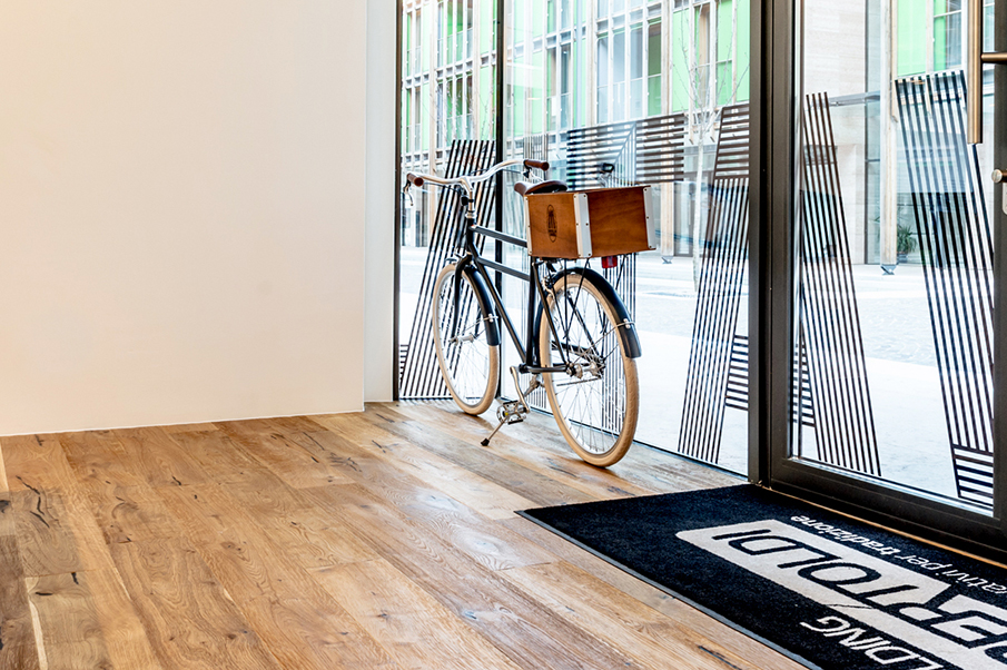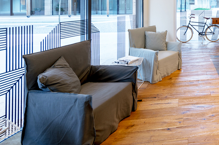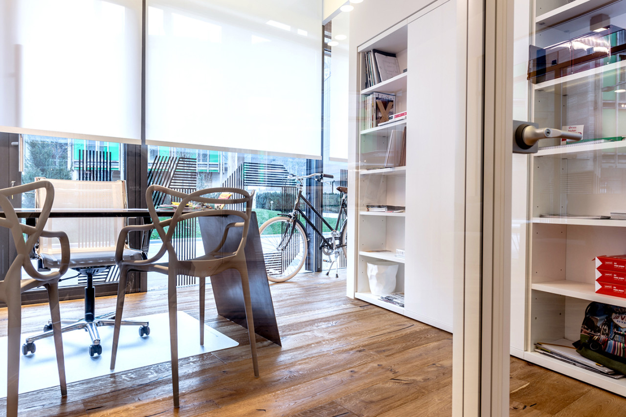 E la grande attenzione nei confronti dell’ambiente e dei materiali naturali si evince anche dagli arredi. Al calore del pavimento in rovere viene accostata la freschezza del lino delle sedute Gervasoni e la lucentezza delle scrivanie in lamiera ferrosa. A dare un tocco originale, infine, alcune biciclette di design, particolari interpreti dello stile di vita green che anima tutto l’intorno architettonico.