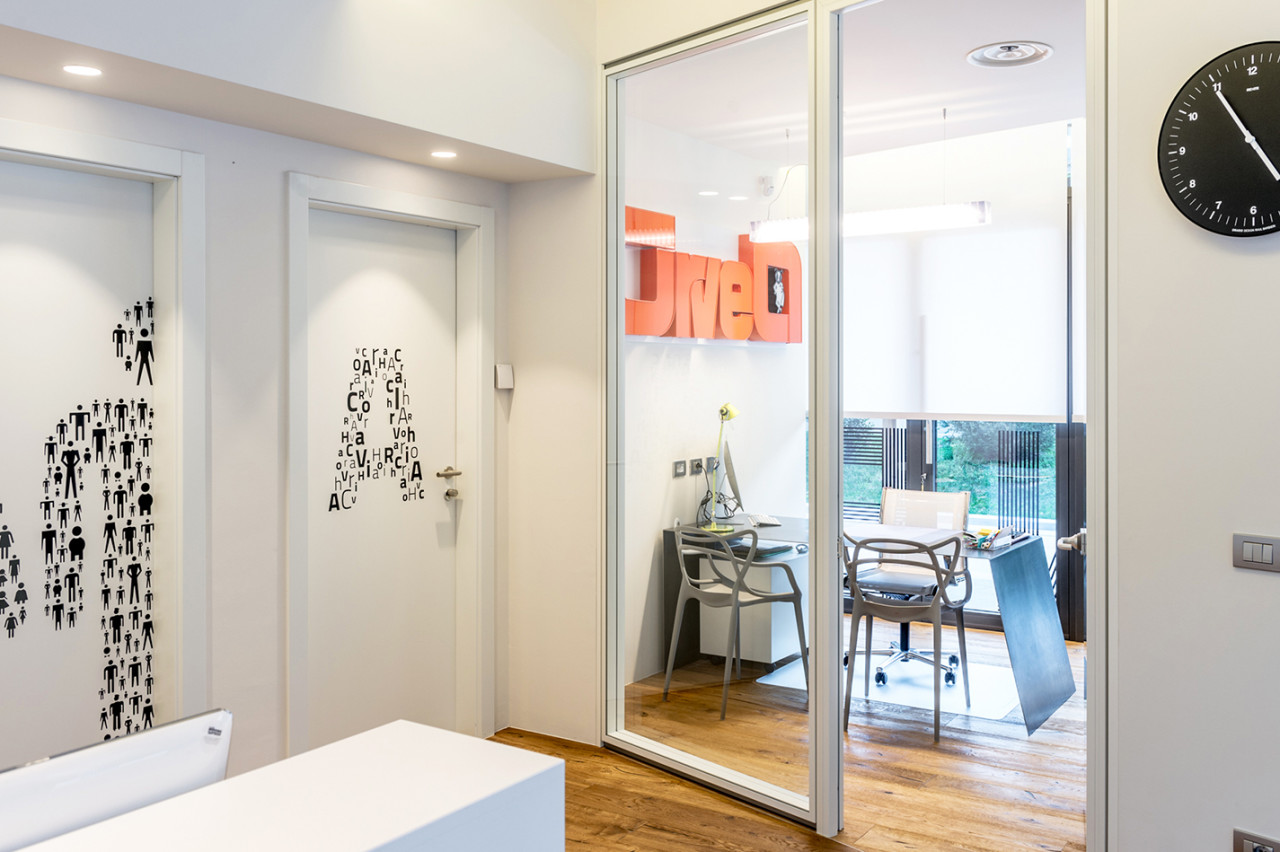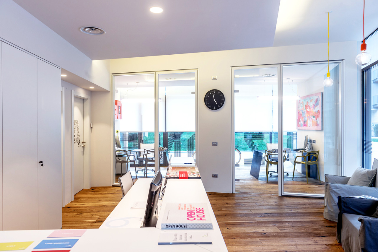Le grandi aperture vetrate, che si stagliano su ben tre lati dell’involucro edilizio, sono l’elemento caratterizzante dell’intera struttura. Le trasparenze, supportate da pareti e arredi total white, trasformano la luce naturale in elemento architettonico, permettendo di definire i diversi scorci prospettici e di misurare lo spazio con semplicità e raffinatezza. La compenetrazione tra architettura e territorio, data dal continuo dialogo tra contesto esterno e attività interne, crea un senso di appartenenza e partecipazione, per un ambiente lavorativo disteso e in linea con le nuove esigenze dell’abitare contemporaneo.