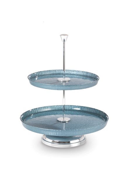 Vetro decorato a mano e metallo argentato, che non ossidano perché protetti da una speciale vernice. Ogni singola alzata è diversa da un altra, perché rappresentativa di un processo di produzione assolutamente artigianale.