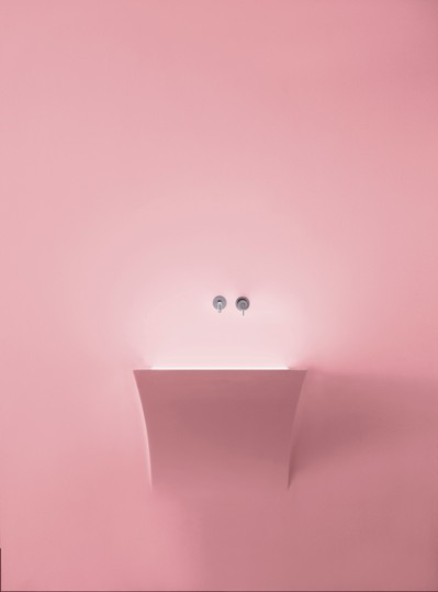 La firma di Domenico de Palo è inconfondibile in questa creazione, un lavabo che sembra voler uscire dalla parete, ma che al tempo stesso gli dà vita e forma. Una volta incassato, garzato e stuccato, può essere rifinito utilizzando la stessa rasatura e tinteggiatura della parete che lo accoglie.