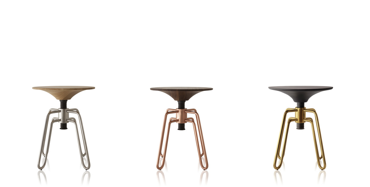 Ottone, rame o acciaio per questo sgabello, rivisitazione umoristica dei banchi da pianoforte, che ha vinto il primo premio al Design Award MCB 2012.