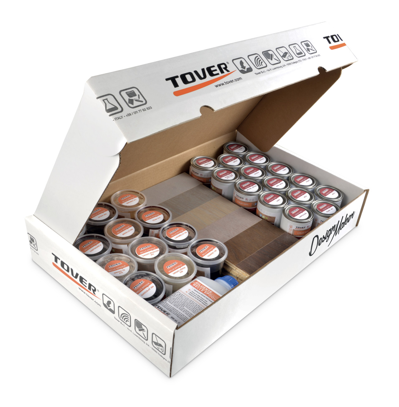 Con Tover Design Maker è possibile realizzare una propria linea di colorazione per parquet assolutamente originale e personalizzata, dalle tonalità più tradizionali fino a quelle più contemporanee, con la sicurezza di un risultato privo di difetti. Tover ha pensato di mettere a disposizione un kit per sperimentare e realizzare direttamente in laboratorio, in cantiere o in showroom colori esclusivi e di design. E tutto questo in pochi minuti.