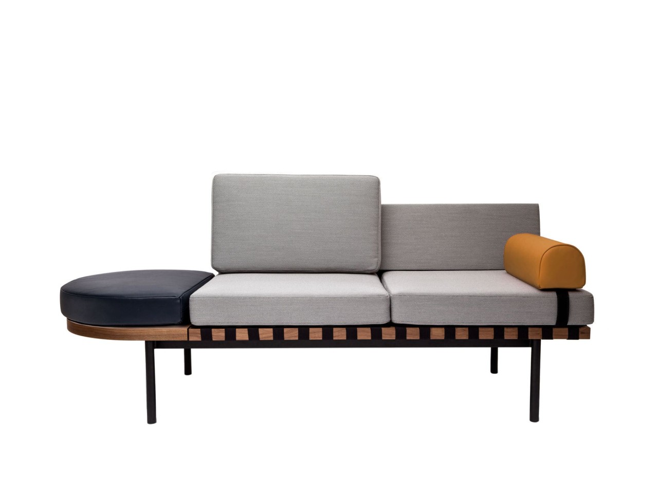 Legno, acciaio, tessuto (o pelle) sono i materiali di cui si compone questo divano multifunzione, capace di trasformarsi in sgabello, poltrona, tavolino, divano d’angolo, divano a due posti, dormeuse.