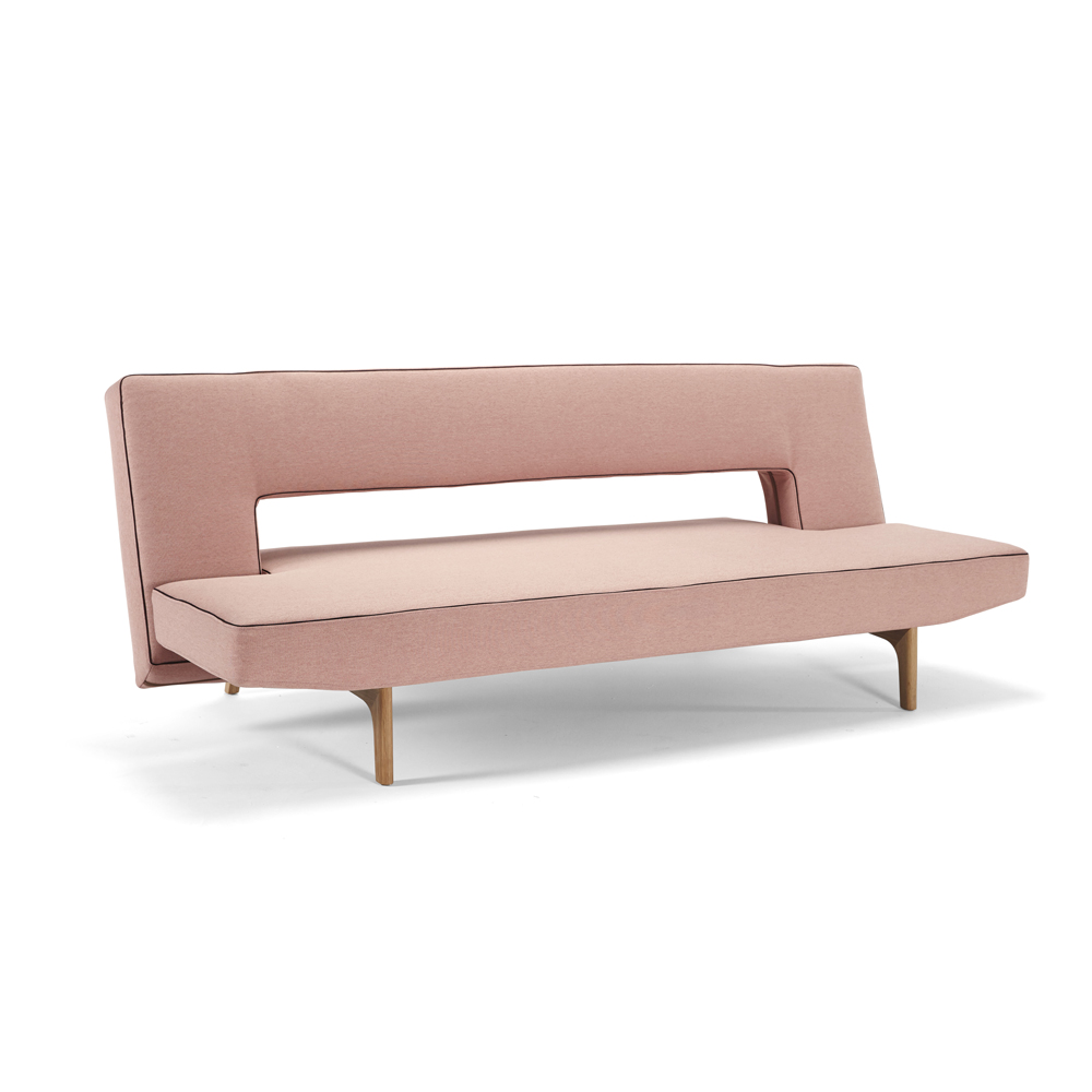 Un divano letto dal design molto caratteristico, qui nella versione rosa corallo. I piedini sono in legno di rovere, lo schienale è regolabile in 3 posizioni: con semplici gesti, Puzzle Wood può diventare divano, relax o letto.