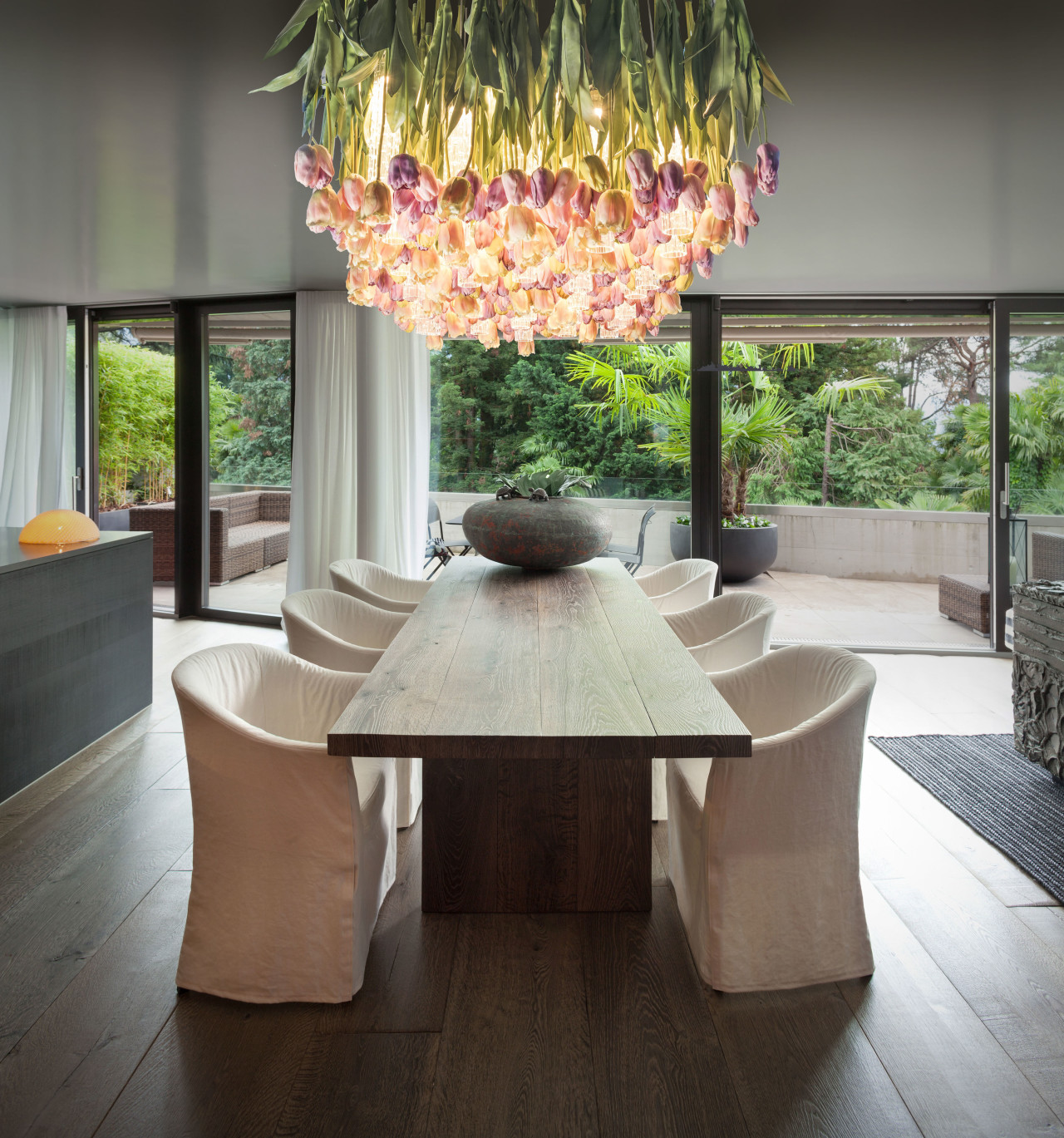 Un inno alla primavera dove il risveglio della natura incanta con i suoi colori accesi e le sue sfumature delicate. Un tripudio di tulipani rosati che illumina con assoluta originalità, in mezzo ai quali delle lampade in vetro di Murano con illuminazione a LED trovano la loro naturale collocazione.