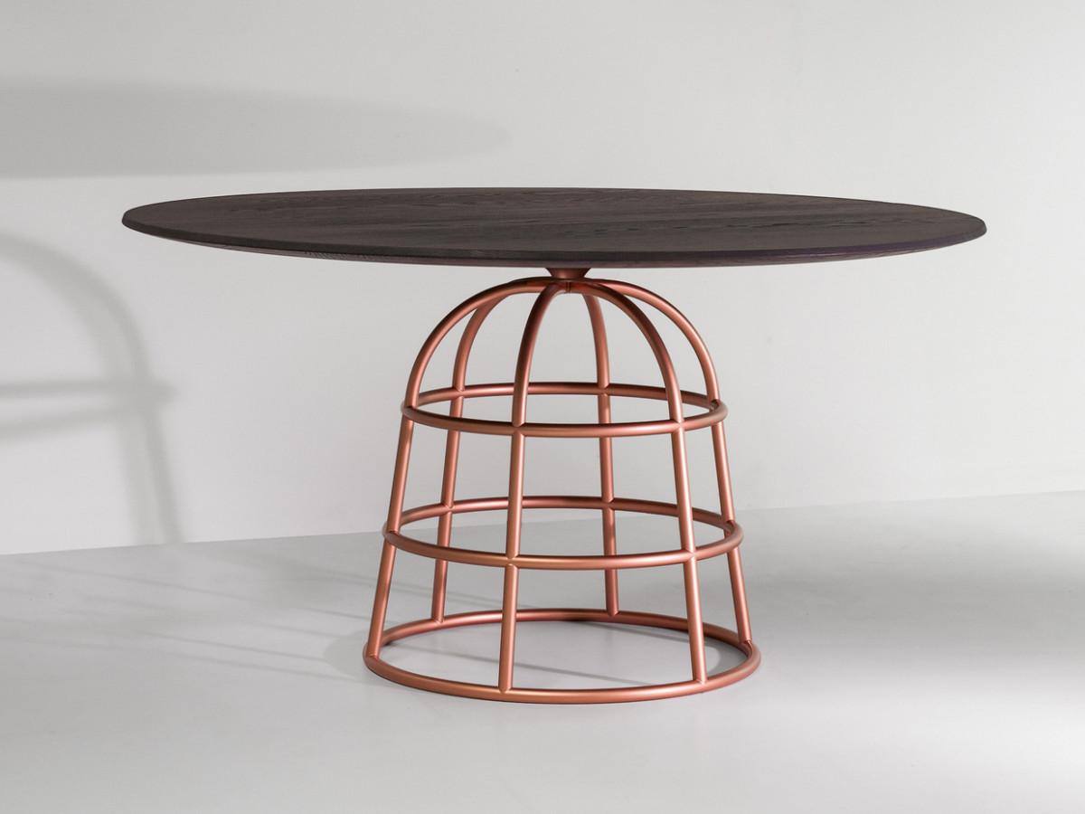 Questo pezzo di Alain Gilles segna una rottura con il tradizionale archetipo di tavolo composto da una base solida e imponente. Qui la base diventa una componente leggera, mentre è il piano in legno ad occupare maggiormente lo spazio visivo.