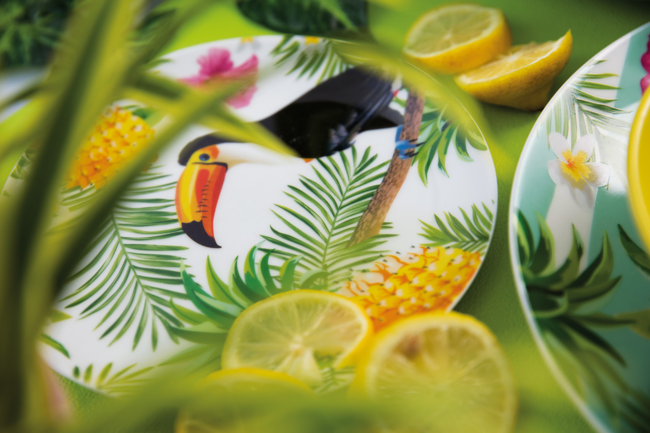 Un servizio supercolorato, ideale per pranzi o cene en plein air. Il celeste dei piatti fondi riprende il mare cristallino, mentre la fantasia nature dei piatti piani e di quelli da frutta rimanda alla natura rigogliosa ed incontaminata tipica del Costa Rica, da cui prende il nome con ananas e tucani, posti su alberi dalle fronde verdi.