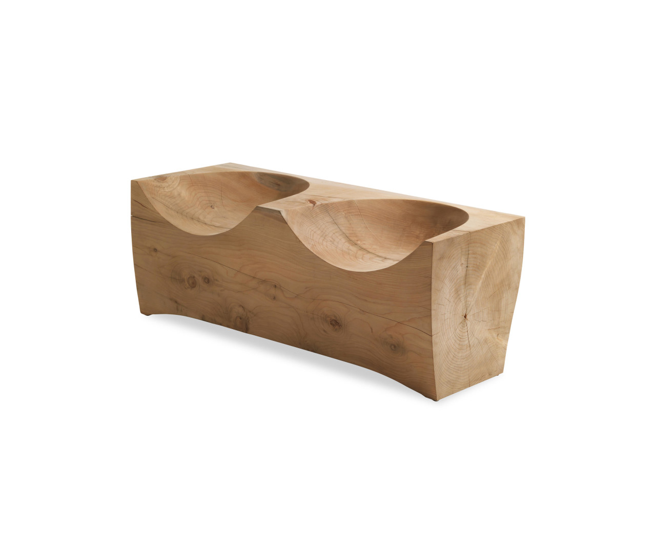 Linee squadrate e seduta ergonomica per questa doppia poltrona in legno massello di cedro profumato lavorata da un blocco unico. Disponibile nella versione ad uno o due posti a sedere.