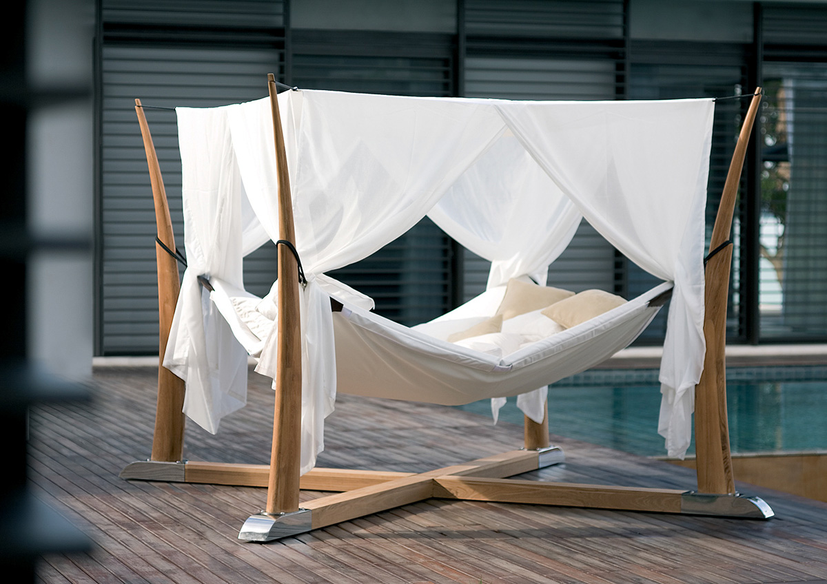 È realizzata in teak di elevatissima qualità questa amaca di grandi dimensioni, sorretta da quattro montanti elegantemente arcuati. Le finiture della base e i moschettoni per il fissaggio di Kokoon sono in acciaio inox, la seduta è morbidamente imbottita e dotata di fodera lavabile, un telo superiore assicura una delicata schermatura dal sole.