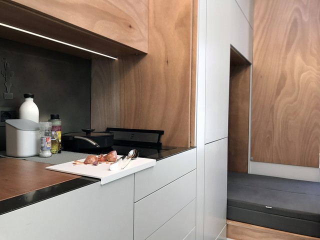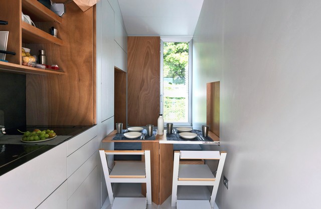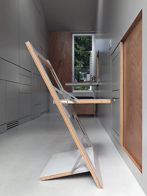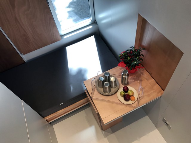 aVOID è un prototipo di casa su ruote che in soli 9 metri quadrati racchiude ogni comfort necessario per il vivere quotidiano. Ispirata all’equilibrio del vuoto, da cui prende il nome (a void = un vuoto), si presenta come una singola stanza grigia sviluppata longitudinalmente e priva di qualsiasi arredo. Attraverso l’apertura di specifici dispositivi a parete, però, lo spazio evolve orizzontalmente e si trasforma, adempiendo a tutte le più comuni funzioni di un’abitazione. Il letto reclinabile diviene prima divano per l’angolo studio e poi, abbinato al tavolo pieghevole, comoda panca per due persone. La parete lascia spazio ad una cucina accessoriata con cappa aspirante, lavello a scomparsa, piano cottura e scaffali contenitivi. L’ampia porta finestra Schüco a tra ante del fronte sud, progettata in modo personalizzato per questo contesto, permette sia l’illuminazione naturale dello spazio, sia la sua apertura totale verso l’esterno. Un piccolo bagno in okumè ospita i servizi e una doccia concepiti per ridurre al minimo i consumi di acqua. Una scala retrattile permette infine l’accesso alla terrazza, l’angolo più suggestivo per sentirsi a tutti gli effetti cittadini del mondo.
