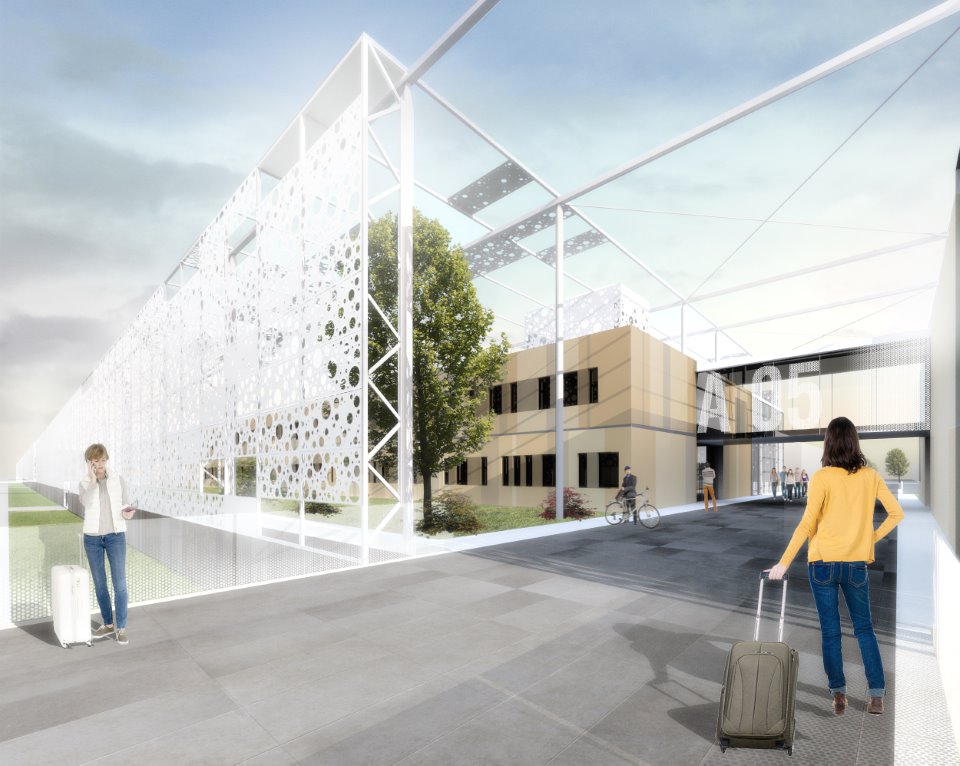 Il 1° premio (10 mila euro) è stato assegnato allo studio di architettura ArkLab in collaborazione con Serena Babini e Annalisa Ricci. Vincente l’idea principale di “rivestire” le strutture esistenti con pannelli perforati che, come un abito prezioso, coprono e al tempo stesso esibiscono l’edificio. Il progetto enfatizza il sistema ortogonale cardodecumanico, una caratteristica predominate del Centergross, e presenta soluzioni stilistiche volte a creare un abile gioco tra pieni e vuoti in grado di definire gli spazi del futuro fashion hub: una coesistenza armoniosa di uffici, attività commerciali ed aree verdi.