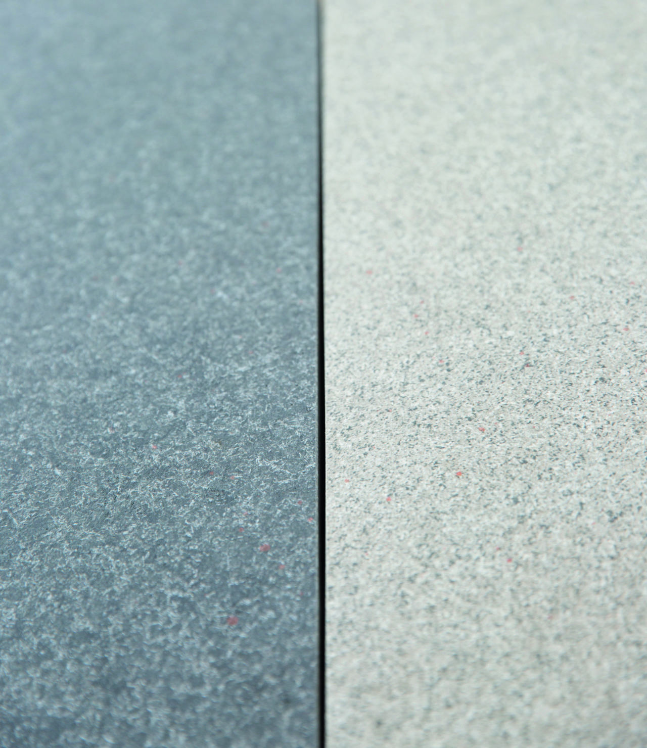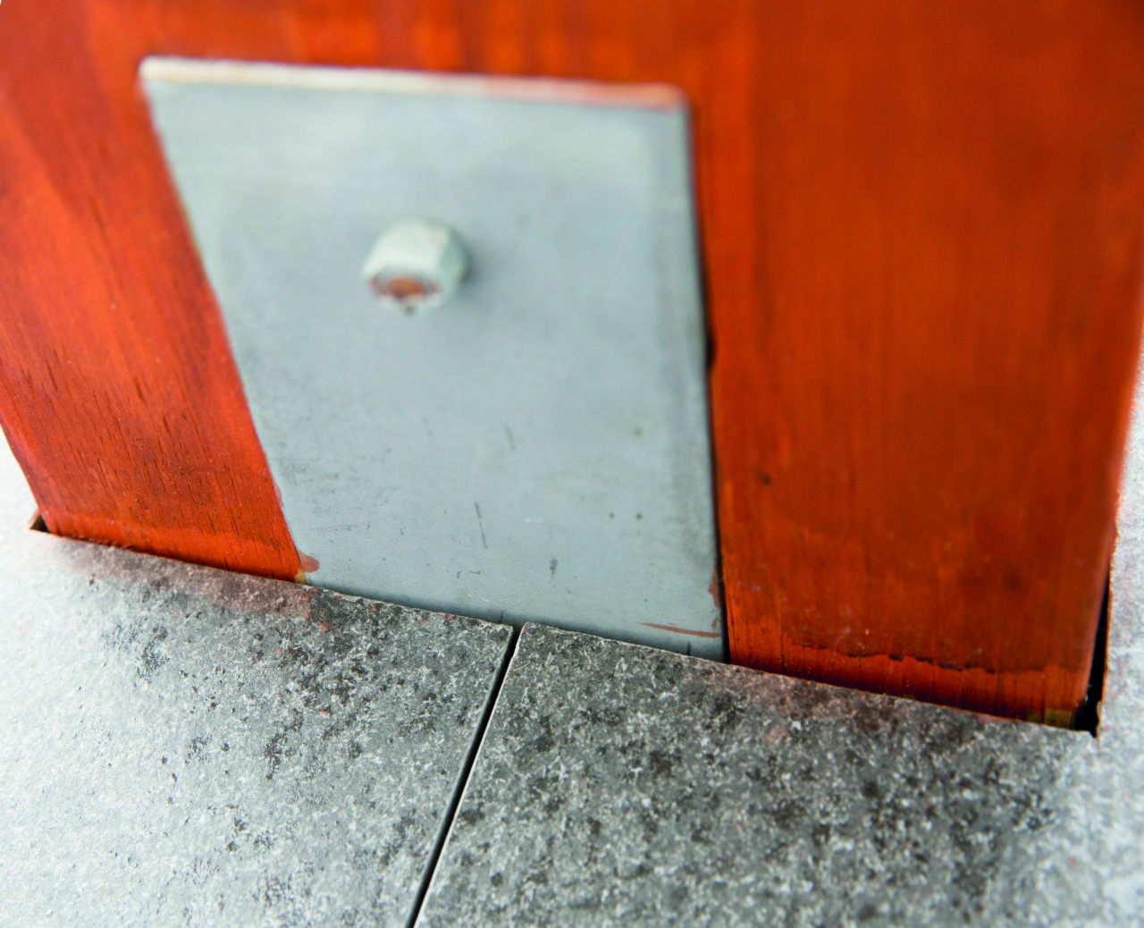 La pavimentazione, ampie piastrelle in porcellana grigio scuro e chiaro, hanno formato 60×60 cm e ricoprono oltre 600 mq. Al di sotto, si trovano ben 2300 supporti regolabili Impertek Pedestal, con testa autolivellante Balance (che corregge automaticamente la pendenza del terreno fino al 5% per una pavimentazione finale perfettamente livellata), teste con specifiche alette per pavimentazioni in pietra e teste progettate per pavimentazioni decking, i correttori di pendenza CP e clips per la realizzazione di gradini e battuta verticale perfetti.