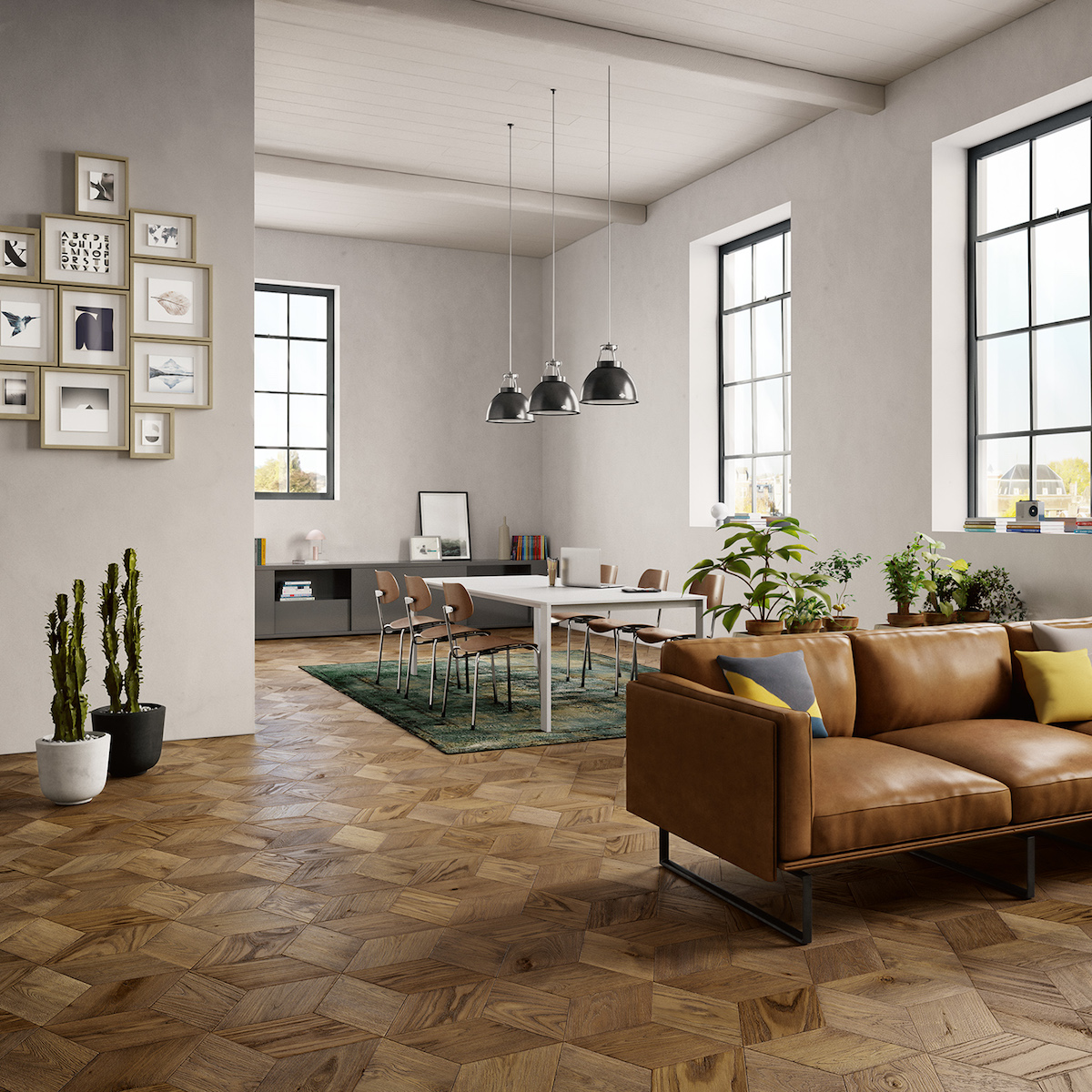 La spina per esagono è una geometria che permette di proporre pavimenti dinamici e tridimensionali, ideali per chi necessita di rivestimenti dal carattere forte e iconico. Ogni singolo esagono viene prodotto unendo tre diversi listelli a forma di spina: l’accostamento dei moduli conferisce movimento alla superficie, trasformandola in un palcoscenico sfaccettato e cangiante.