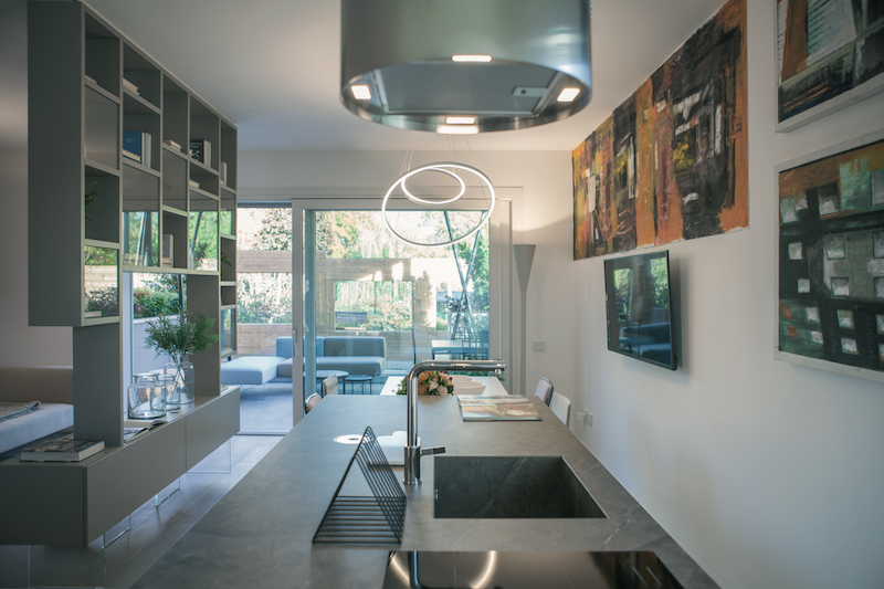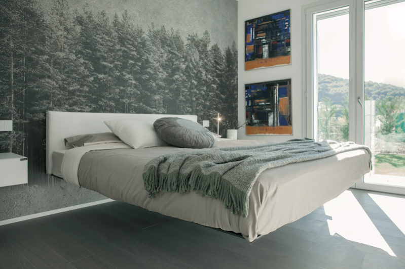 All’interno del Lago Tower l’open space ospita cucina e soggiorno, separate con leggerezza da una libreria Weightless che scende dal soffitto come una stalattite. A completare l’ambiente anche un ampio divano Air a cui si accompagna un tavolo sospeso che accoglie cuochi e commensali. La cameretta dei bambini si trasforma, invece, nel regno della fantasia: il letto Weightless, sospeso e soppalcato, diventa un fortino ideale per accogliere il gioco e il riposo.