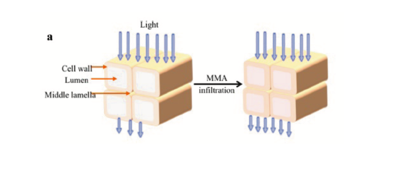Un ulteriore prodotto derivato dal legno è quello chiamato legno trasparente. Il progetto è stato sviluppato, sembra contemporaneamente, dagli stessi ricercatori del legno densificato appartenenti all’Università del Michigan (USA) e da altri facenti parte del KTH Reale Institute of Technology di Stoccolma (Svezia). In particolare, questi ultimi sono riusciti a rendere il legno trasparente attraverso un processo chimico tramite il quale le cellule del legno sono state “ripulite” dei componenti opachi (lignina) e unite a polimeri trasparenti. Il primo passo in questo metodo è appunto quello di rimuovere la lignina, una sostanza che non solo irrigidisce il legno ma crea anche il suo colore brunastro. I ricercatori utilizzando del piallaccio di legno, dopo aver rimosso la lignina impregnano a livello nanometrico le cavità cellulari con metilmetacrilato (MMA) prepolimerizzato. Poiché l’indice di rifrazione del MMA corrisponde a quello del legno privo di lignina, i raggi di luce passano attraverso il composito MMA – legno senza essere riflessi internamente. L’obiettivo che i ricercatori si sono posti è stato quello di poter sostituire le lastre di vetro per finestre, serramenti con superfici vetrate ed essere utilizzato nella realizzazione della parte trasparente delle celle solari. Il nuovo materiale avrebbe una notevole resistenza meccanica tipica del legno di base utilizzato, resistenza agli urti, caratteristica che il vetro invidia al legno, bassa conducibilità termica e leggerezza. A queste va aggiunta la buona trasparenza. Le prove fatte hanno evidenziato che una lastra di legno trasparente riesce a far passare l’85% della luce. La non completa trasparenza (relativa opacità) può essere però un vantaggio in termini d’irradiazione solare degli interni. A tutto ciò si accompagna il fatto che la materia prima per la produzione del legno trasparente è assolutamente rinnovabile. Lo sviluppo della ricerca sarà quello di migliorare la trasparenza, utilizzare altre specie legnose, lo studio è stato fatto sul legno di balsa, e realizzare campioni di dimensioni maggiori.