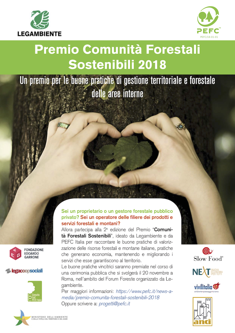 PEFC Italia e Legambiente hanno assegnato i premi “Comunità Forestali Sostenibili” il 20 novembre scorso a Roma, durante il Forum sulla Bioeconomia Forestale, con la collaborazione di Next – Nuova economia per tutti, Fondazione Edoardo Garrone, LegacoopSociali, Slow Food, Vivilitalia e la Consulta delle aziende certificate PEFC. I riconoscimenti, giunti alla seconda edizione, intendono valorizzare e sostenere le buone pratiche di gestione territoriale e forestale delle aree interne della penisola.