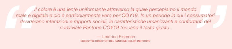 Vivace ma delicato, Living Coral è il Pantone Color of the year 2019: una tinta che avvolge con calore e affetto, infondendo conforto e ottimismo in un mondo in continuo cambiamento.