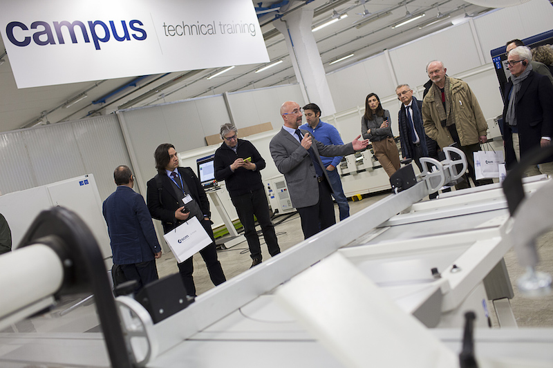 Il Campus occupa un’area complessiva di 1300 metri quadrati, con 9 aule, uffici e un training center allestito con macchine SCM, dedicato alla formazione dei tecnici di assistenza.