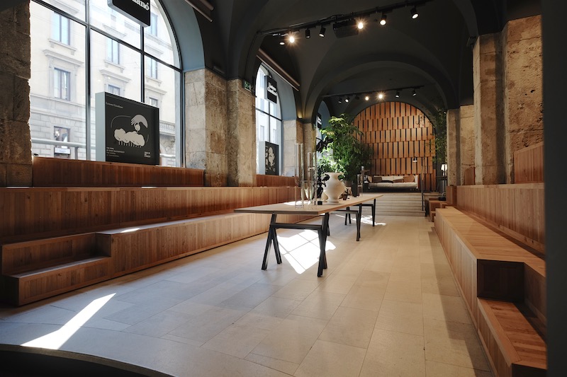 “Il protagonista dello spazio è il legno – spiega De Lucchi – insieme ai materiali che hanno segnato la storia dell’uomo… È uno spazio espositivo del futuro, non più centrato sulla relazione commerciale tra venditore e acquirente, ma sullo scambio culturale, emozionale e sul trasferimento di conoscenza”.