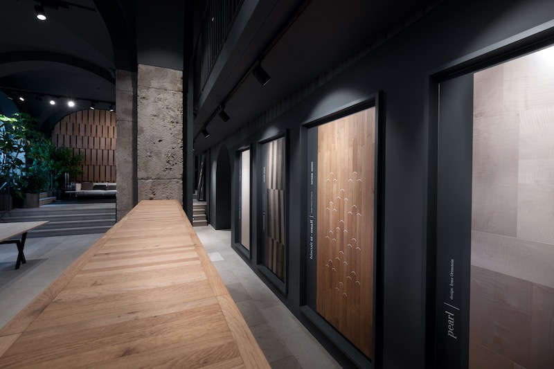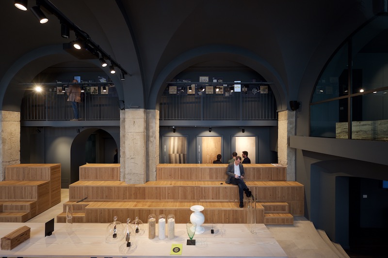 “Il protagonista dello spazio è il legno – spiega De Lucchi – insieme ai materiali che hanno segnato la storia dell’uomo… È uno spazio espositivo del futuro, non più centrato sulla relazione commerciale tra venditore e acquirente, ma sullo scambio culturale, emozionale e sul trasferimento di conoscenza”.