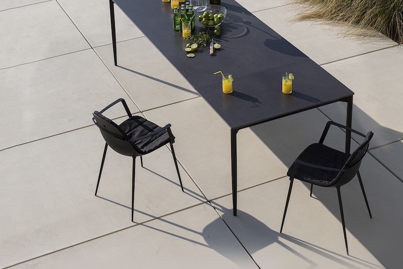In giardino come in salotto. Per il tavolo Marguerite non c’è nessuna differenza. Per il piano consigliamo l’esclusivo Wood On Glass (WOG), uno strato sottilissimo di legno combinato con il vetro nero temprato.