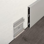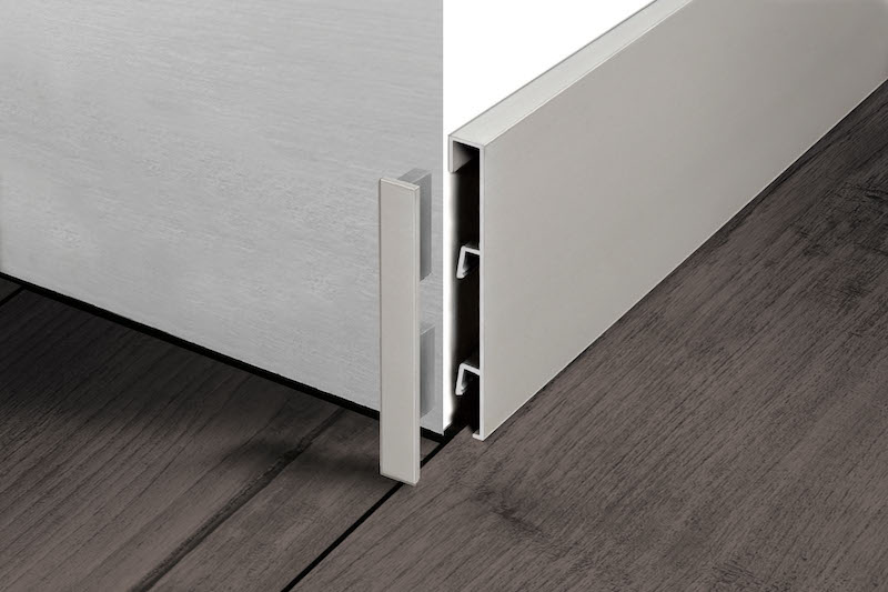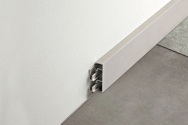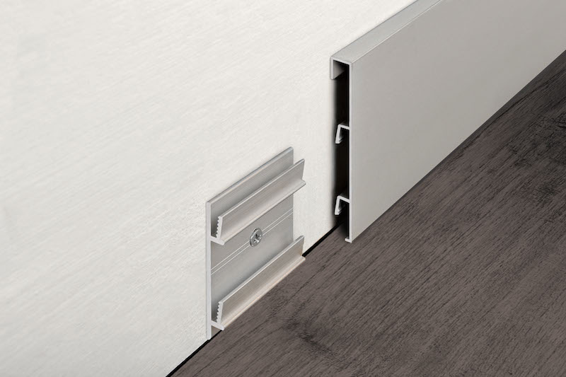 Il nuovo battiscopa, se scelto nella versione non ispezionabile, può essere fissato alla parete con un adesivo oppure direttamente con i tasselli dell’apposito supporto in alluminio. Per garantire una perfetta messa in opera finale, Progress Profiles mette a disposizione anche tappi di chiusura, raccordi esterni e spigoli interni per tutte le varianti in catalogo.