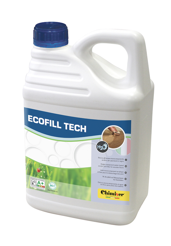 Ecofill Tech di Chimiver è uno stucco all’acqua monocomponente acrilico privo di solvente da utilizzare, miscelato con la polvere prodotta dalla levigatura, per la rasatura del pavimento in legno.