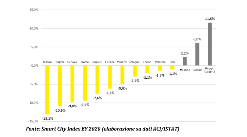 Andrea D’Acunto, Mediterranean Government and Public Sector leader di EY, dichiara: “Da diversi anni le città nel nostro Paese si stanno evolvendo in maniera sensibile verso la sostenibilità, attivando diverse iniziative per essere a basso impatto ambientale, favorire la mobilità sostenibile e ridurre fenomeni come l’inquinamento atmosferico e il congestionamento del traffico. Dallo Smart City Index di EY emerge che alcuni indicatori negli ultimi anni sono cresciuti in maniera esponenziale soprattutto nelle città metropolitane di Milano, Torino, Bologna o nelle città medie del Nord. Se osserviamo la mobilità sostenibile, ad esempio, le auto elettriche ed ibride sono più che triplicate negli ultimi 4 anni registrando un aumento del 259% dal 2016; anche il parco circolante ha registrato una diminuzione di auto importante dal 2002 al 2018, solo Milano ha ‘eliminato’ oltre 100.000 veicoli dalla città. E’ presente tuttavia ancora un grande divario con le città del Sud, ad eccezione di Lecce e Bari che si collocano tra le prime 50 nella classifica dedicata al tema della sostenibilità”.