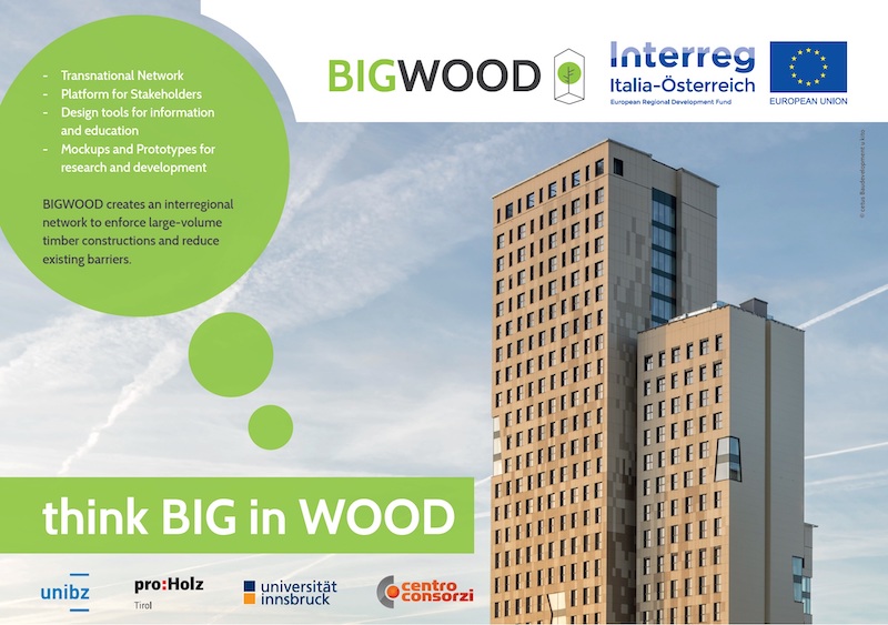 Costruzioni in legno, sostenibili anche per grandi volumetrie ed elevazioni. BigWood (https://bigwood.projects.unibz.it), progetto europeo Interreg transfrontaliero tra Alto Adige, Tirolo austriaco e Veneto, porterà alla creazione di una rete di università, imprese, professionisti ed esperti nel settore per diffondere le costruzioni in legno multipiano e garantire elevati standard di qualità. Il programma prevede la realizzazione di modelli dimostrativi di edifici multipiano interamente realizzati in legno, tra cui uno in scala reale nel Parco Tecnologico NOI di Bolzano, aperto e visitabile dal pubblico.