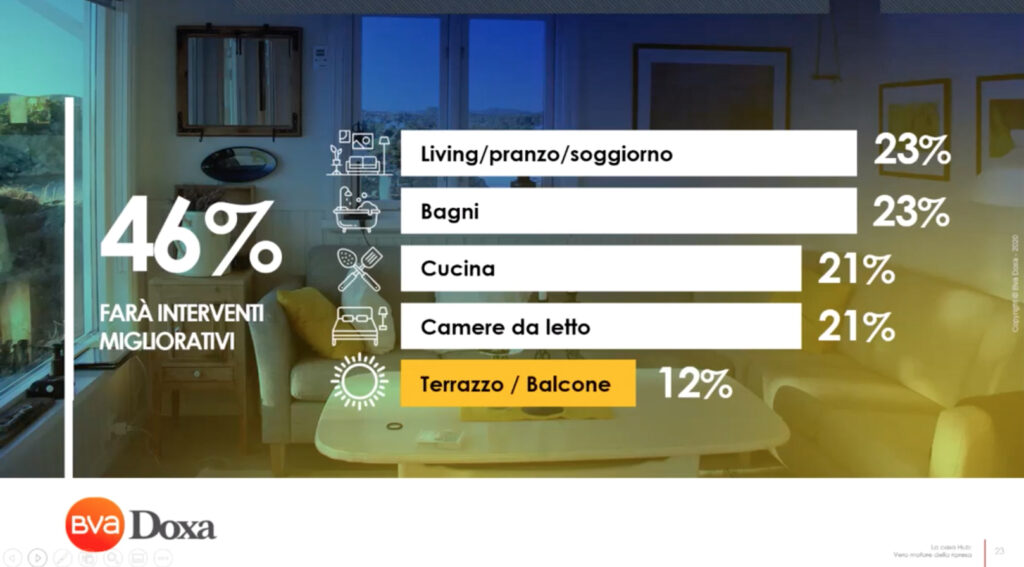 Il 46% degli italiani sta già facendo o ha in mente di fare interventi sulla propria abitazione, mentre il 12% vorrebbe addirittura cambiare casa perché l’esperienza del lockdown ha evidenziato alcune inadeguatezze di quella in cui si abita attualmente.