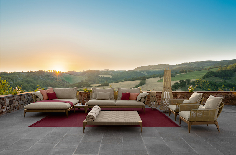 È ispirata al mondo della nautica la collezione Cruise di Talenti. L’uso di materiali nobili come il legno nella base, associato a un’accurata selezione dei tessuti, conferisce un appeal elegante sofisticato all’intera linea. La corda, vera protagonista, avvolge schienali e braccioli di ogni elemento. Designer: Ludovica + Roberto Palomba.