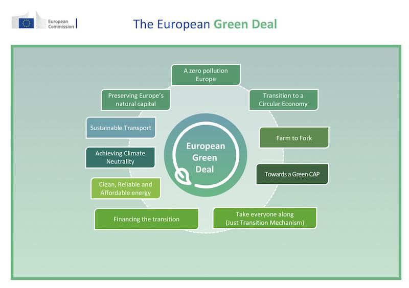 Presentato ufficialmente a dicembre 2019, l’European Green Deal è il documento con cui la Commissione europea inaugura un nuovo corso nella lotta ai cambiamenti climatici e alle sfide legate all’ambiente e alle risorse naturali, attraverso la progettazione di nuovi obiettivi di sostenibilità (Par. 2.1.1) e di investimenti in energia pulita (Par. 2.1.2), circular economy (Par. 2.1.3), edilizia sostenibile (Par. 2.1.4), mobilità smart (Par 2.1.5), filiere alimentari giuste ed environmental-friendly (Par 2.1.6), conservazione del patrimonio naturale (2.1.7) e diminuzione delle emissioni (2.1.8). Questi punti ricalcano i 17 Obiettivi di Sviluppo Sostenibile (Sustainable Development Goals, SDGs) individuati dall’ONU e al centro dell’Agenda 2030, il programma d’azione sottoscritto nel settembre 2015 dai governi di 193 paesi, e potranno contare su almeno 1 trilione di euro di investimenti, diretti o indiretti, nel prossimo decennio.