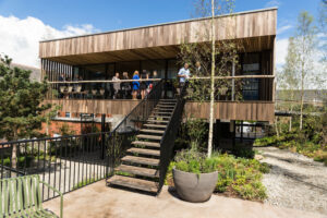 La struttura esterna di quest’opera permanente è realizzata con pannelli tulipier (CLT) a cinque strati con uno spessore di 100 mm, porte e finestre sono in rovere, l’arredamento in latifoglia e la pavimentazione delle logge in frassino. Infine, il soffitto a doghe è stato realizzato con il legno avanzato dal processo di fabbricazione dei pannelli di legno a strati incrociati in modo da evitare sprechi.