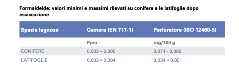 Un ulteriore spunto di riflessione riguarda la tendenziale maggior presenza di formaldeide nelle conifere piuttosto che nelle latifoglie sebbene in letteratura esistano anche dati contradditori a tal proposito. Tale variabilità è probabilmente imputabile all’influenza dei molteplici fattori sopra menzionati, nonché all’incertezza di misura dei metodi di prova adottati su valori estremamente bassi.