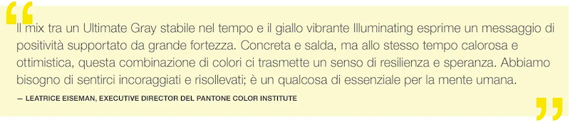 Rinvigorendo lo spirito, il binomio Ultimate Gray e Illuminating sottolinea il desiderio di essere notati, di essere visibili, di essere riconosciuti, di essere ascoltati. Un mix cromatico che, con i suoi richiami all’introspezione, all’innovazione e all’intuizione, oltre che al rispetto per la saggezza, l’esperienza e l’intelligenza, ispira rigenerazione, spinge verso nuovi concetti e nuovi modi di pensare.