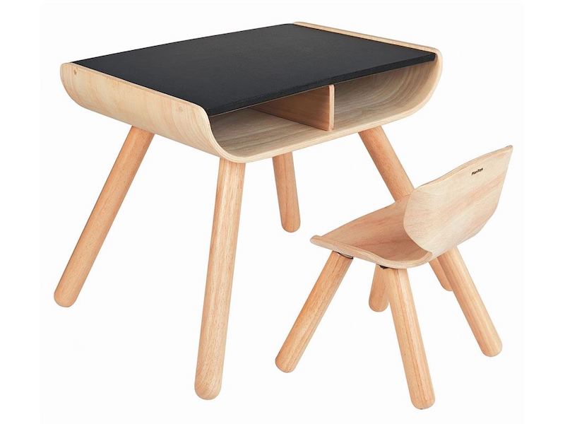 Un bellissimo set composto da scrivania-tavolo e sedia in legno massello, con linee morbide e angoli arrotondati per disegnare, giocare, mangiare. Un piano in ardesia permette di disegnare liberamente anche con i gessetti, due pratici scomparti inferiori sono utili per riporre fogli, matite, pennarelli.