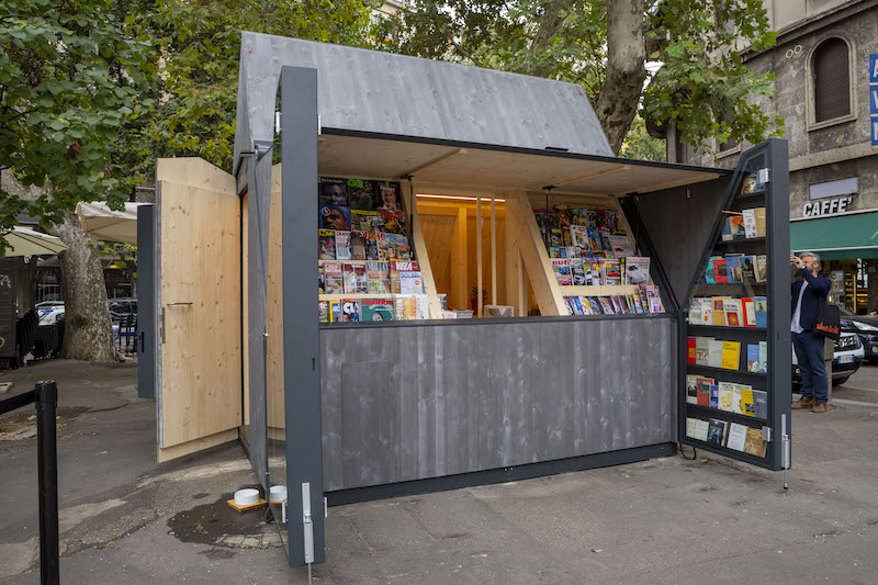 Inaugurata a Milano la prima edicola interamente in legno della metropoli, icona di una città che dopo il Covid ripensa il proprio futuro e il rapporto con l’ambiente. Come un fiore, si apre di giorno e si chiude di notte.