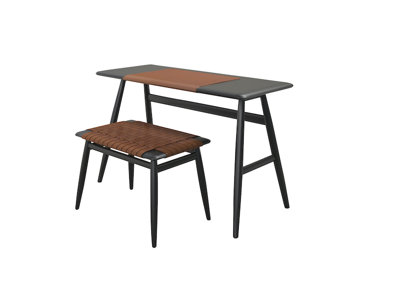 La scrivania e lo sgabello Mo Bridge abbinano volumi puri in acciaio, legno massello di noce o rovere a una preziosa superficie decorativa in cuoio. Liscio o a fasce intrecciate, avvolto intorno ai bordi arrotondati del piano della scrivania e del piano di seduta, il cuoio favorisce una piacevole sensazione di calore sia nella versione naturale che nelle varianti nero, marrone vintage-marrone scuro, burgundy o grigio talpa.