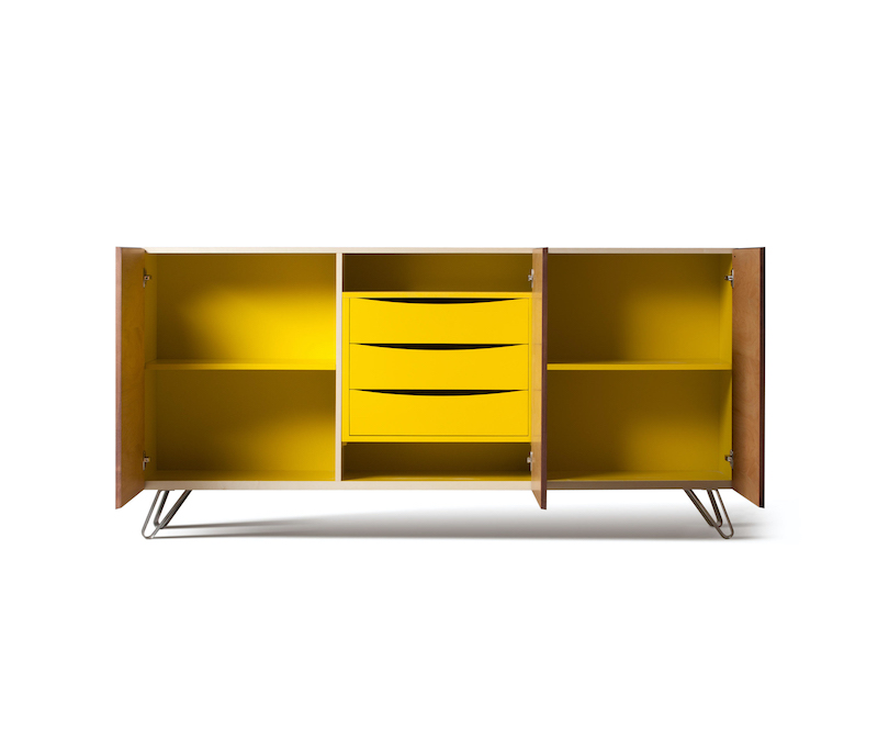 Disegnata da Maurizio Duranti, questa credenza di design ha ante decorate in legno di noce ed è disponibile in diverse varianti, tra cui chiaramente il giallo.