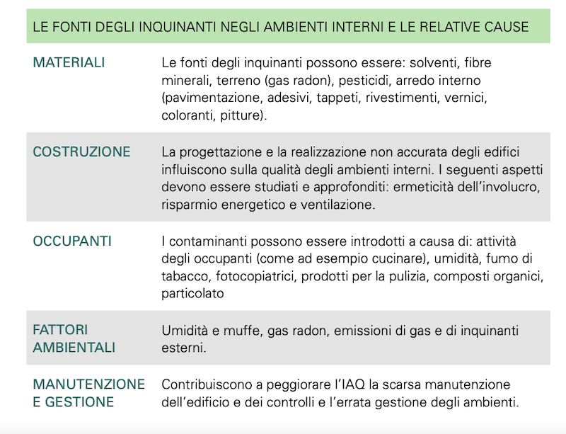 I contaminanti che presentano particolari problemi negli ambienti interni sono il fumo di tabacco, il radon e la formaldeide. Nella tabella sono riportate le fonti degli inquinanti e le relative cause.