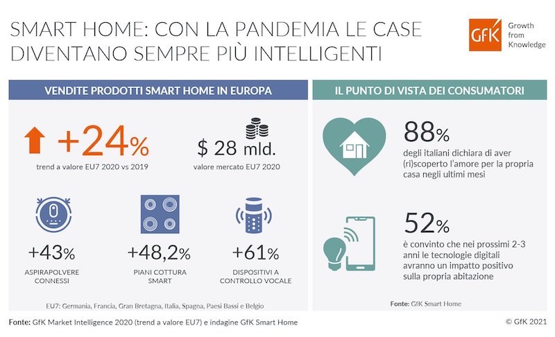 La pandemia ha portato a un’accelerazione della digitalizzazione dei consumatori, anche per quanto riguarda il modo di vivere la casa. Nel corso del 2020 GfK ha registrato un trend molto positivo per la tecnologia di consumo e in particolare il segmento dei dispositivi smart per la casa è cresciuto del +24%, per un controvalore pari a 28 miliardi di dollari nei 7 principali mercati europei.