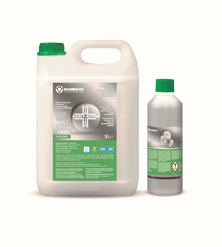 Sanit-Action Finish è una vernice poliuretanica bicomponente all’acqua per pavimenti in legno, formulata con additivi nano particolati che, a diretto contatto con l’acqua, rilasciano ioni argento carichi positivamente, generando sull’elemento ligneo trattato una persistente e impenetrabile barriera igienizzante. Efficace contro i virus (denaturazione molecole del DNA virale), contro i funghi (neutralizzandone le funzionalità) e contro i batteri, provocando la morte dell’organismo unicellulare.