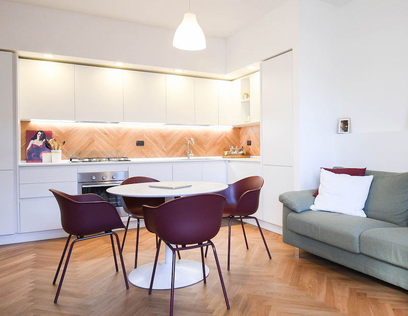 La boiserie, tornata oggi di gran moda, è un rivestimento decorativo applicato sulle pareti o sul soffitto, che ha la capacità di trasformare un’anonima stanza in un ambiente originale. Il vantaggio estetico è evidente: gli ambienti risultano più caldi e accoglienti, con un tocco originale ed elegante che regala personalità e carattere anche agli spazi più anonimi. Si possono trovare interessanti soluzioni progettuali dove arredi, pavimento e pareti risultano perfettamente integrati, a prescindere dallo stile della casa. Qui vediamo la Spina Italiana Naturale Almafloor, utilizzata per il rivestimento del pavimento e ripresa anche nella cucina, come paraschizzi. Un uso davvero insolito che crea continuità nell’ambiente e dimostra che, con i giusti accorgimenti, anche il parquet può essere un materiale estremamente resistente.