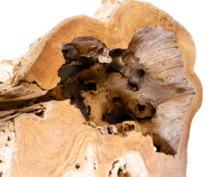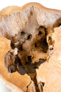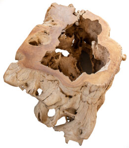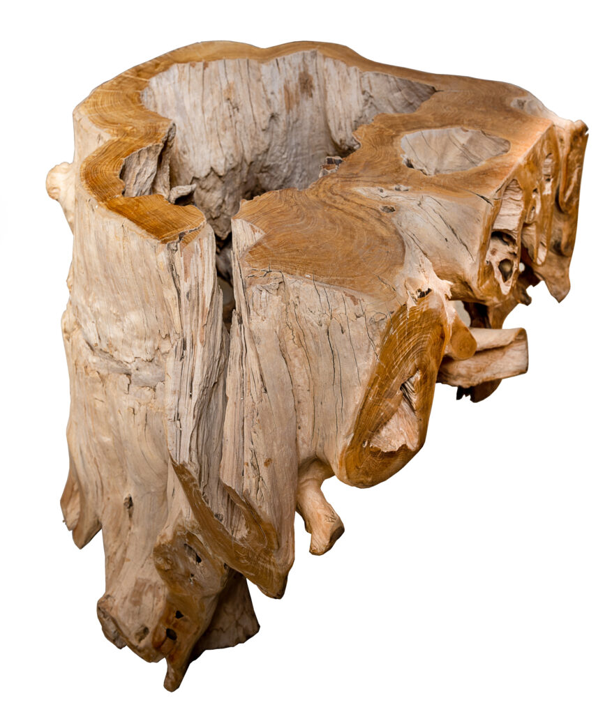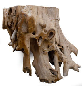 Un’originale consolle costruita a misura dell’estimatore e ogni volta unica, perché ricavata dalle radici dell’albero di Teak (Tectona grandis) da riforestazione, tratte dal suolo a fine vita dell’albero.