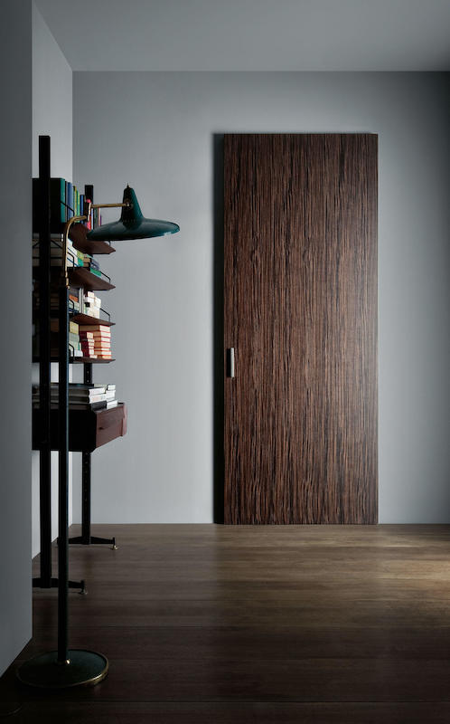 Un sistema combinato di porta scorrevole e di binario telescopico predisposto per essere installato direttamente a parete: può leggersi come una superficie appoggiata alla parete. L’anta scorrevole, la cui tecnologia è completamente a scomparsa, permette di ottenere effetti di grande leggerezza.