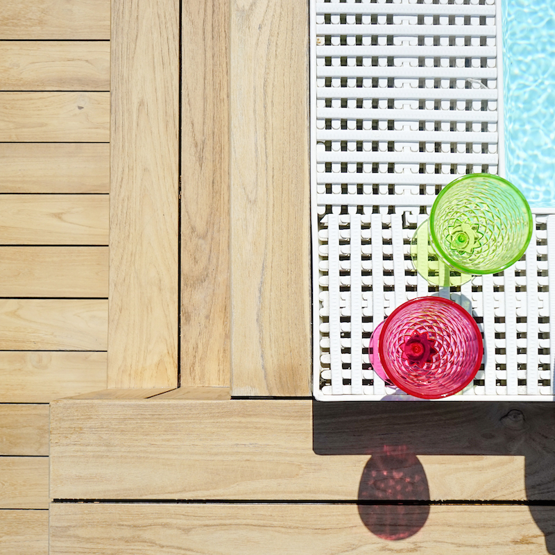 – in tavole precomposte a quadro in Termo Teak o accoppiate in Termo Frassino, con supporto in resina a incastro, per una posa a scacchiera o a correre.
