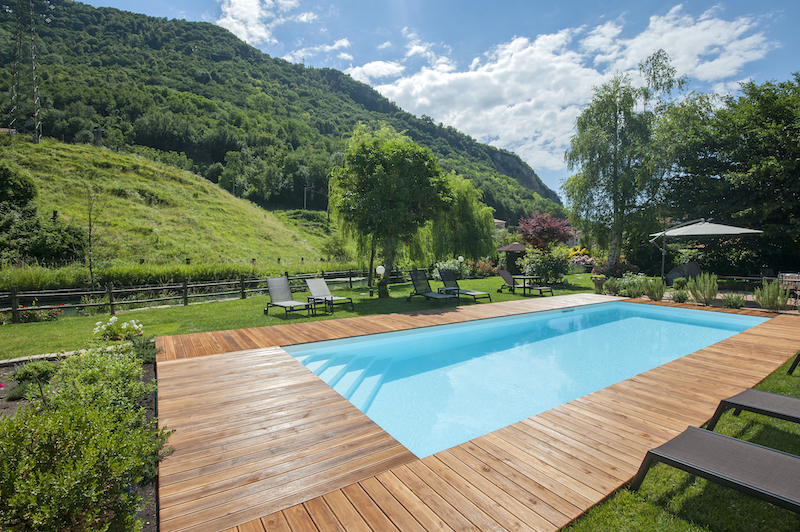 L’Hotel Calvi a Vittorio Veneto, Treviso, è un albergo ai piedi delle Prealpi venete, immerso nel verde e con un giardino a uso esclusivo degli ospiti: una zona incantata, dove trova posto anche una piscina. Per il bordo è stato scelto un pavimento da esterno a marchio Garbelotto in teak massiccio. Le tavole in teak zigrinate antiscivolo sono state posate con clip a scomparsa su magatelli in acciaio, rendendo di fatto invisibile il metodo di posa. La versatilità del legno ha reso possibile far scomparire le due stazioni filtranti dell’acqua, grazie a un ingegnoso sistema che permette di rendere ispezionatile questa parte di pavimentazione.
