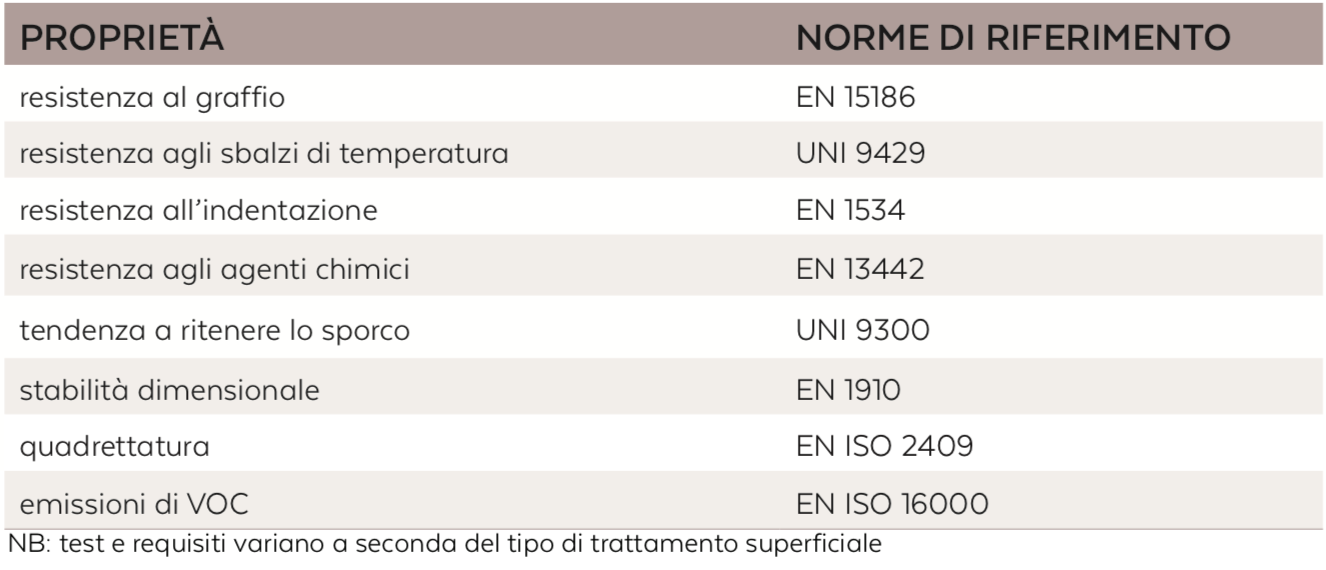 • resistenza meccanica, per caratterizzare il pavimento dal punto di vista fisico attraverso attraverso tre prove fondamentali: la resistenza all’indentazione (Brinell), la resistenza alla delaminazione e la stabilità dimensionale;