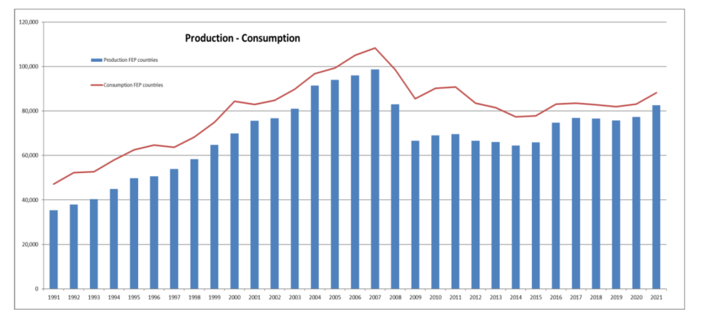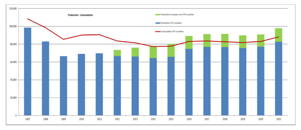 La produzione nel territorio FEP è cresciuta di quasi il 7% nel 2021 e ha superato la soglia degli 82 milioni di metri quadrati. Un livello che non si vedeva dall’inizio della crisi finanziaria. La produzione europea al di fuori dei paesi FEP è stimata in 15,3 milioni di metri quadrati – 9,7 milioni di metri quadrati prodotti nei paesi dell’UE e 5,6 milioni di metri quadrati nei paesi europei non UE.